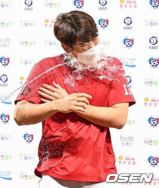 경기종료 후 시즌 4승 달성한 SSG 이태양이 동료들의 축하 물세례를 받고 있다. 2022.05.27 / soul1014@osen.co.kr