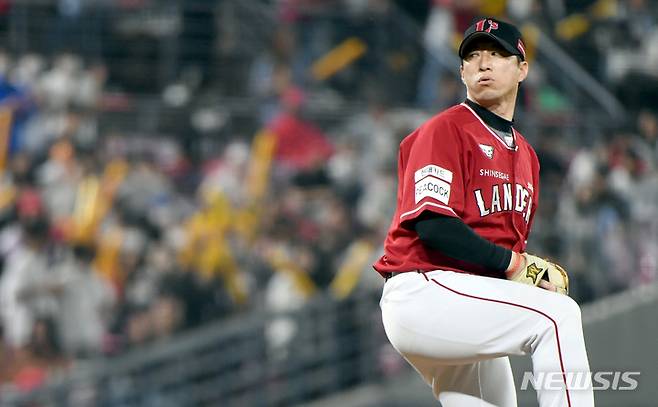 [광주=뉴시스] 류형근 기자 = 27일 오후 광주 북구 광주-기아챔피언스필드에서 열린 2022프로야구 KIA 타이거즈 대 SSG 랜더스의 경기, 8회말 무사에서 등판한 SSG 바뀐투수 고효준이 역투하고 있다. 2022.05.27. hgryu77@newsis.com