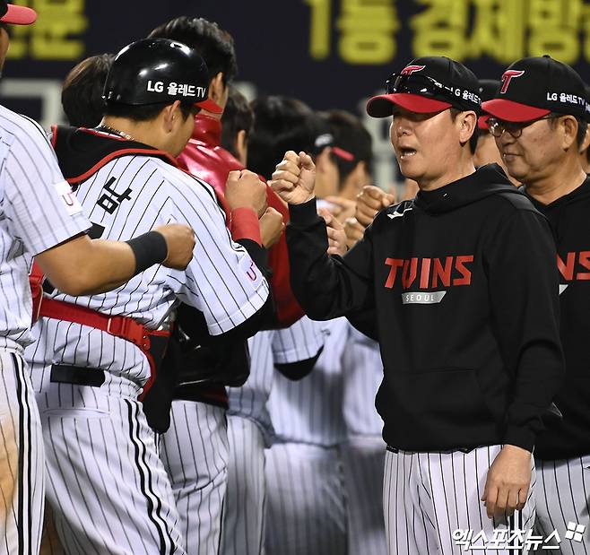 경기 종료 후 LG 류지현 감독이 선수들과 승리의 기쁨을 나누고 있다.