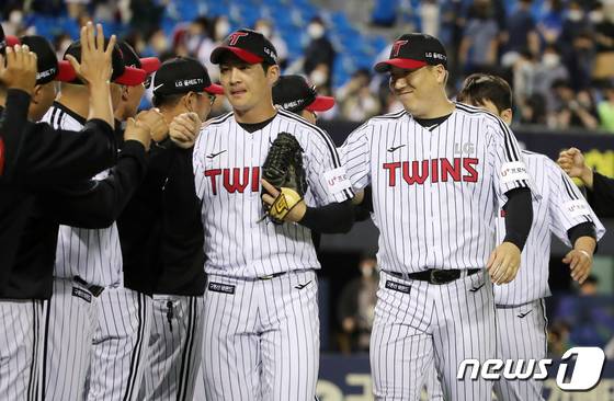 (서울=뉴스1) 김진환 기자 = 27일 오후 서울 송파구 잠실야구장에서 열린 프로야구 '2022 신한은행 SOL KBO리그' 삼성라이온즈와 LG트윈스의 경기, 5대0 승리를 거둔 LG 김현수가 코칭스테프들과 하이파이브를 하고 있다. 2022.5.27/뉴스1