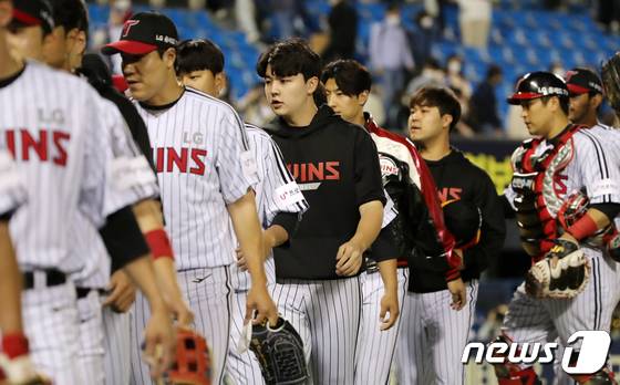(서울=뉴스1) 김진환 기자 = 27일 오후 서울 송파구 잠실야구장에서 열린 프로야구 '2022 신한은행 SOL KBO리그' 삼성라이온즈와 LG트윈스의 경기, 5대0 승리를 거둔 LG 이민호(가운데)가 코칭스테프들과 하이파이브를 하고 있다. 2022.5.27/뉴스1