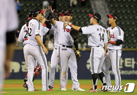 (서울=뉴스1) 김진환 기자 = 27일 오후 서울 송파구 잠실야구장에서 열린 프로야구 '2022 신한은행 SOL KBO리그' 삼성라이온즈와 LG트윈스의 경기, 5대0 승리를 거둔 LG 선수들이 기쁨을 나누고 있다. 2022.5.27/뉴스1