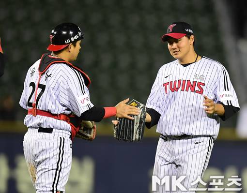 LG 유강남과 이재원이 승리 후 기뻐하고 있다.