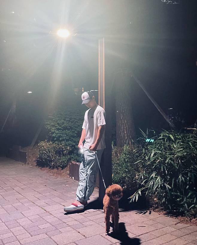 사진 속에는 한밤 중 반려견과 산책 중인 전진 류이서 부부의 모습이 담겨있다.