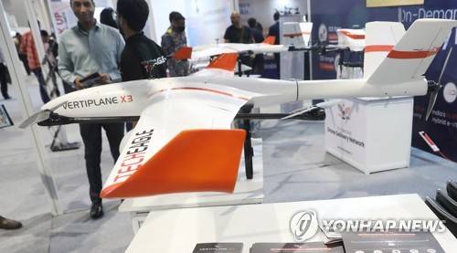 epa09979707 A drone from the on-demand delivery network TechEagle is displayed during the India Drone Festival in New Delhi, India 27 May 2022. More than 70 exhibitors are expected to participate. EPA/HARISH TYAGI