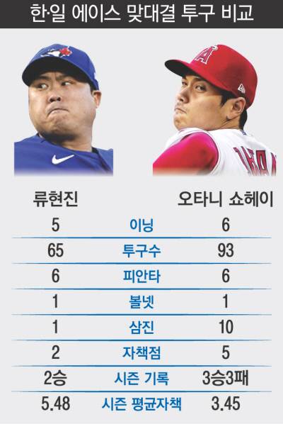 류현진은 ‘타자 오타니’와의 세 차례 승부에서 안타 없이 볼넷 1개만 내주고 삼진 1개를 잡았다. 1-0으로 앞선 1회말 마운드에 오른 류현진은 1사 1루에서 오타니와 처음 마주했다. 바깥쪽을 집요하게 공략했지만 오타니는 방망이를 휘두르지 않았다. 결국 풀카운트 승부 끝에 볼넷을 내줘 1사 1·2루에 몰렸다. 하지만 후속타자를 병살로 처리하며 한숨을 돌렸다.