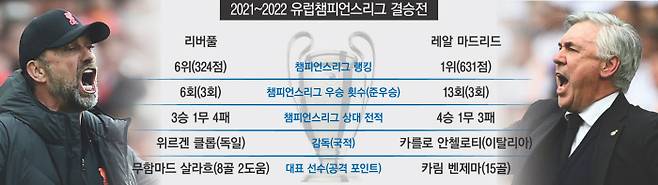 리버풀(잉글랜드)과 레알 마드리드(스페인)가 29일 오전 4시 프랑스 파리의 생드니 스타드 드 프랑스에서 2021~2022 유럽챔피언스리그 결승전을 벌인다.