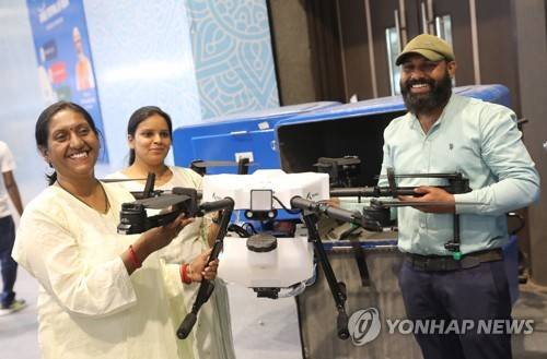 epa09979739 Drone pilots hold the Adrinet, a drone designed for spraying crops, monitoring its health or broadcast seeding, during the India Drone Festival in New Delhi, India 27 May 2022. More than 70 exhibitors are expected to participate. EPA/HARISH TYAGI