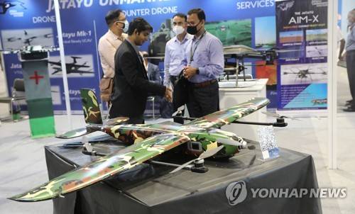 epa09979727 A drone named Jatayu, which is an unmanned system for surveillance, is displayed during the India Drone Festival in New Delhi, India 27 May 2022. More than 70 exhibitors are expected to participate. EPA/HARISH TYAGI