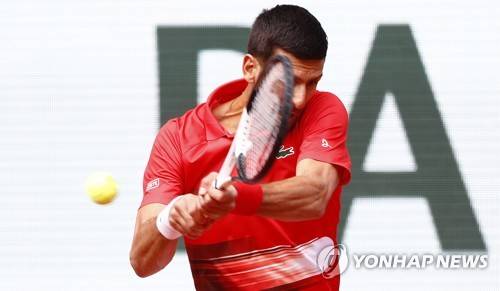 epa09979870 Novak Djokovic of Serbia hits a backhand in the men's third round match against Aljaz Bedene of Slovenia during the French Open tennis tournament at Roland Garros in Paris, France, 27 May 2022. EPA/MOHAMMED BADRA