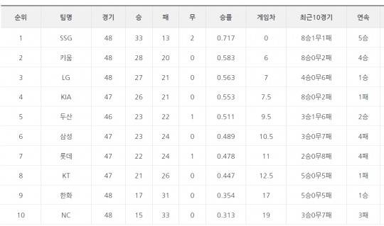 [팀 순위]SSG, 나란히 4연승 달리던 KIA 누르고 5연승으로 선두 질주 이어가..삼성과 롯데는 에이스 내세우고도 영패 당하며 4연패 빠져