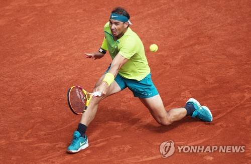 epa09979914 Rafael Nadal of Spain plays a backhand in the men's third round match against Botic van de Zandschulp of the Netherlands during the French Open tennis tournament at Roland Garros in Paris, France, 27 May 2022. EPA/MARTIN DIVISEK
