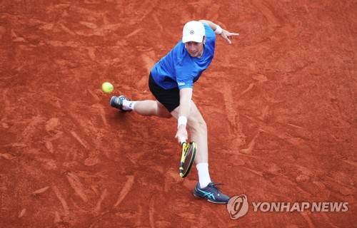 epa09979939 Botic van de Zandschulp of the Netherlands hits a backhand in the men's third round match against Rafael Nadal of Spain during the French Open tennis tournament at Roland Garros in Paris, France, 27 May 2022. EPA/MARTIN DIVISEK
