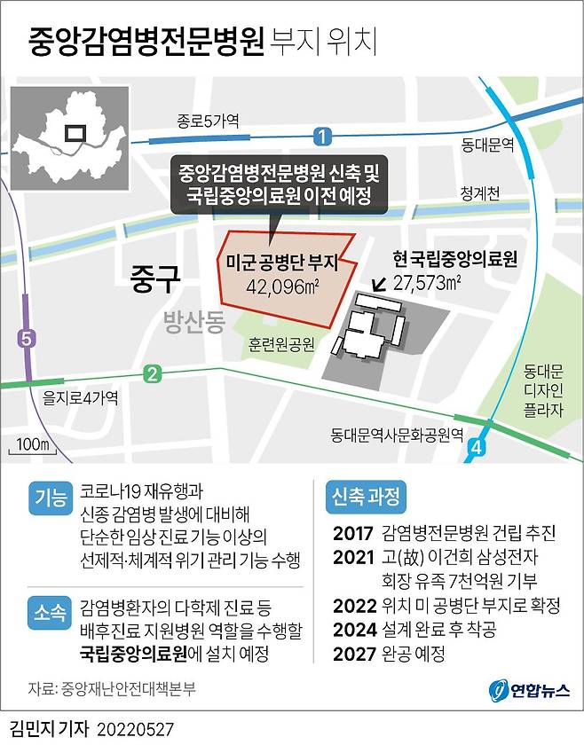 고(故) 이건희 삼성전자 회장 유족이 지난해 4월 코로나19 등 감염병 대응을 위한 병원을 세워 달라며 7000억원을 기부하면서 추진된 중앙감염병전문병원이 오는 2027년 서울 중구 방산동 미군 공병단 부지에 들어선다. 당초 서울 서초구 원지동에 신축할 계획이었지만 소음 기준 등에 맞지 않아 이곳에 새롭게 터를 잡았다.
