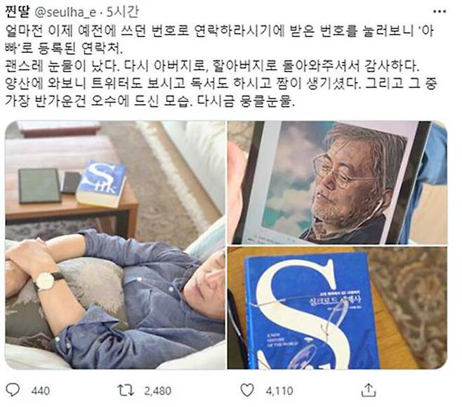 다혜 씨는 "얼마 전 '이제 예전에 쓰던 번호로 연락하라' 하시기에 받은 번호를 눌러보니 '아빠'로 등록된 연락처"라며 "괜스레 눈물이 났다. 다시 아버지로, 할아버지로 돌아와 주셔서 감사하다"라고 적었습니다.