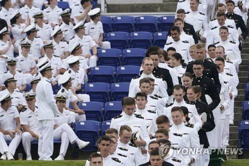 Midshipmen arrive for the U.S. Naval Academy's graduation and commissioning ceremony at the Navy-Marine Corps Memorial Stadium in Annapolis, Md., Friday, May 27, 2022. (AP Photo/Susan Walsh)