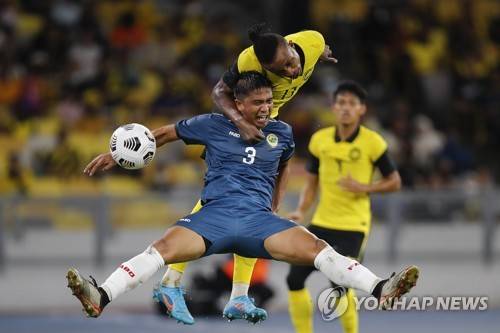 epa09979990 Mohamadou Sumareh Sumareh (top) of Malaysia in action against Abdul Muiz Sisa (below) of Brunei during the AFC Asian Cup qualifier soccer match between Malaysia and Brunei in Kuala Lumpur, Malaysia, 27 May 2022. EPA/FAZRY ISMAIL