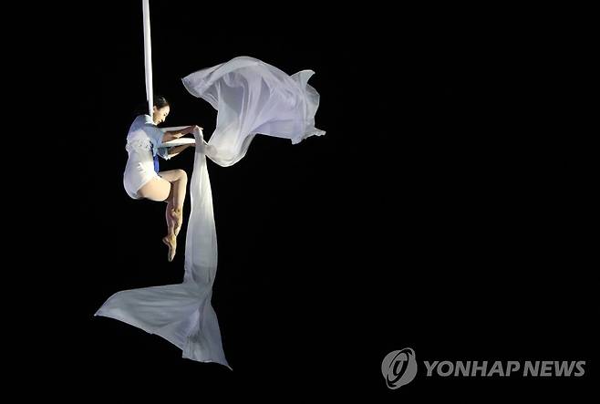(춘천=연합뉴스) 양지웅 기자 = 27일 오후 강원 춘천시 삼천동에서 열린 2022 춘천마임축제의 주요 공연인 '불의도시; 도깨비난장'에서 무용수가 공중 공연을 펼치고 있다. 2022.5.27