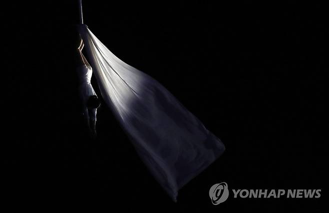 (춘천=연합뉴스) 양지웅 기자 = 27일 오후 강원 춘천시 삼천동에서 열린 2022 춘천마임축제의 주요 공연인 '불의도시; 도깨비난장'에서 무용수가 공중 공연을 펼치고 있다. 2022.5.27
