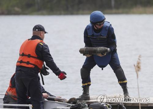 epa09980012 A picture taken during a trip organized by the Ukrainian State Emergency Service shows Ukrainian rescuers retrieving a shell from a lake in Gorenka village, not far from Kyiv, Ukraine, 27 May 2022. On 24 February, Russian troops invaded Ukrainian territory starting a conflict that has provoked destruction and a humanitarian crisis. EPA/SERGEY DOLZHENKO