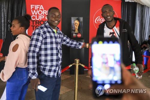 epa09980075 Kenyan soccer fans pose for a photo next to the FIFA World Cup Trophy (C) on display during the FIFA World Cup Tour public viewing event for members of the public in Nairobi, Kenya, 27 May 2022. During the worldwide Tour of the Trophy the Cup will be on display in at least 22 countries. EPA/Daniel Irungu