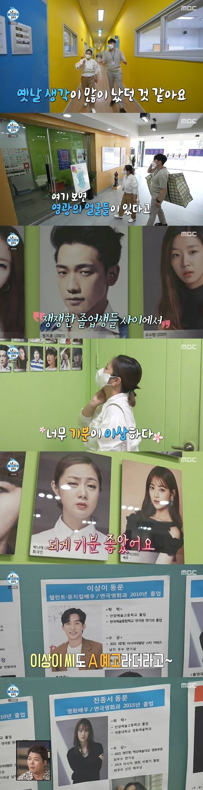 박나래는 중앙 계단에 붙은 이상이, 전종서 등 사진도 발견했따. 박나래는 “이상이 씨도 안양 예고라고 하더라. ‘나혼산’에서 만났다. 전종서 씨도 여기나. 여기 출신들 많네”라고 반가워 했다.