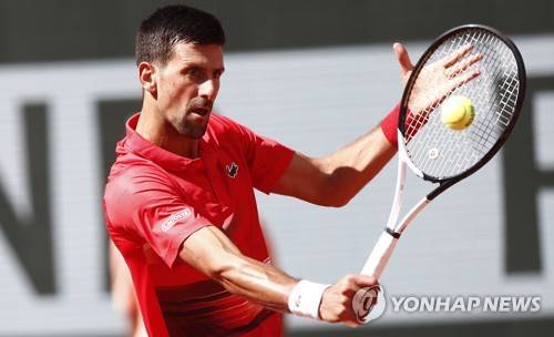 epa09980110 Novak Djokovic of Serbia hits a backhand in the men's third round match against Aljaz Bedene of Slovenia during the French Open tennis tournament at Roland Garros in Paris, France, 27 May 2022. EPA/MOHAMMED BADRA