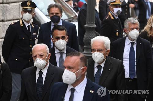 epa09980546 Italian President Sergio Mattarella (2-R), Italian Foreign Minister Luigi Di Maio (4-R) and the President of Campania Region, Vincenzo De Luca (L), on occasion of the funeral service of Italian politician and former Prime Minister, Ciriaco De Mita, outside the church of Sant'Amato in Nusco, Italy, 27 May 2022. EPA/CIRO FUSCO