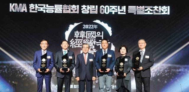 한국능률협회는 27일 서울 그랜드하얏호텔에서 ‘제52회 한국의 경영자상’ 시상식을 열었다. 사진은 수상자들. 왼쪽부터 김기남 삼성전자 종합기술원 회장, 조현준 효성그룹 회장, 이봉서 한국능률협회 회장, 정지선 현대백화점그룹 회장, 한현옥 클리오 사장, 김창수 에프앤에프 회장.