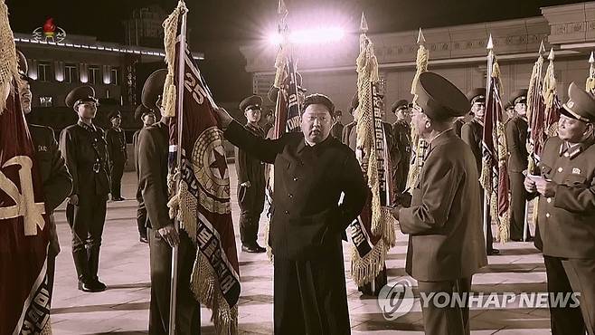 (서울=연합뉴스) 조선중앙TV가 지난 27일 4월 25일 열병식 준비과정이 담긴 새로운 기록영화 '조선의 존엄과 위용을 과시한 주체의 열병식'을 공개했다. 영화에는 열병식 초기 구상 단계부터 훈련과정까지 열병식 개최 전 과정에 세세히 관여하고 점검하는 김정은 국무위원장의 모습이 소상하게 담겼다. [조선중앙TV화면] 2022.5.28