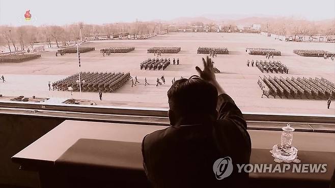 (서울=연합뉴스) 조선중앙TV가 지난 27일 4월 25일 열병식 준비과정이 담긴 새로운 기록영화 '조선의 존엄과 위용을 과시한 주체의 열병식'을 공개했다. 영화에는 열병식 초기 구상 단계부터 훈련과정까지 열병식 개최 전 과정에 세세히 관여하고 점검하는 김정은 국무위원장의 모습이 소상하게 담겼다. [조선중앙TV화면] 2022.5.28