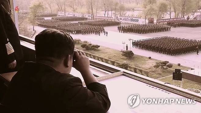 (서울=연합뉴스) 조선중앙TV가 지난 27일 4월 25일 열병식 준비과정이 담긴 새로운 기록영화 '조선의 존엄과 위용을 과시한 주체의 열병식'을 공개했다. 영화에는 열병식 초기 구상 단계부터 훈련과정까지 열병식 개최 전 과정에 세세히 관여하고 점검하는 김정은 국무위원장의 모습이 소상하게 담겼다. [조선중앙TV화면] 2022.5.28