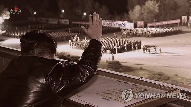 (서울=연합뉴스) 조선중앙TV가 지난 27일 4월 25일 열병식 준비과정이 담긴 새로운 기록영화 '조선의 존엄과 위용을 과시한 주체의 열병식'을 공개했다. 영화에는 열병식 초기 구상 단계부터 훈련과정까지 열병식 개최 전 과정에 세세히 관여하고 점검하는 김정은 국무위원장의 모습이 소상하게 담겼다. [조선중앙TV화면] 2022.5.28