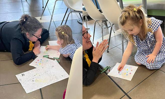 하퍼는 갑자기 다가온 레이첼에 놀랐는지 의자 밑으로 숨었고, 레이첼은 고민하지 않고 바닥에 엎드리며 흰 종이와 색연필을 하퍼에게 건넸습니다.