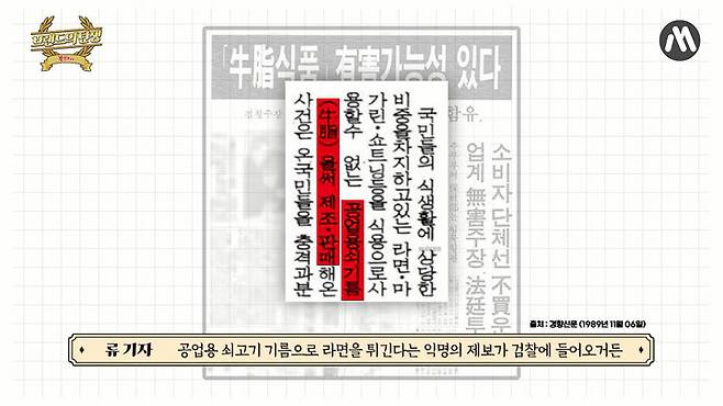 이러한 상황에서 1989년 우지 파동이 터지면서 삼양식품은 더욱 궁지에 몰립니다. 우지 파동은 공업용 쇠고기 기름으로 라면을 튀긴다는 익명 제보가 퍼지면서 세상이 발칵 뒤집힌 일인데요. 농심은 팜유를 사용해 우지 파동에서 제외될 수 있었지만 삼양식품은 우지를 사용하던 상황이라 기업이 휘청거릴 정도로 큰 위기를 맞았습니다.