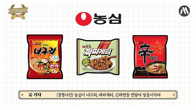 그렇게 삼양식품은 삼양라면으로 한국인의 입맛을 사로잡는 데는 성공했지만, 농심이 라면 사업에 뛰어들면서 첫 위기를 맞이하게 됩니다. 농심은 너구리, 짜파게티, 신라면 등을 연달아 성공시키며 뒤를 바짝 쫓았고 결국 삼양식품은 업계 1위 자리를 내어주게 됩니다.