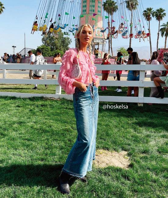 사랑스러운 페스티벌 룩을 찾고 있다면 모델 엘사 호스크의 패션이 있다. 러플 장식의 핑크 컬러 블라우스와 데님 스커트, 귀여운 양 갈래 브레이드 헤어로 전원풍 스타일을 완성했다. 복근을 과감하게 드러내는 관능미까지! 미니 숄더백으로 캐주얼한 매력을 잘 살린 센스가 돋보인다.