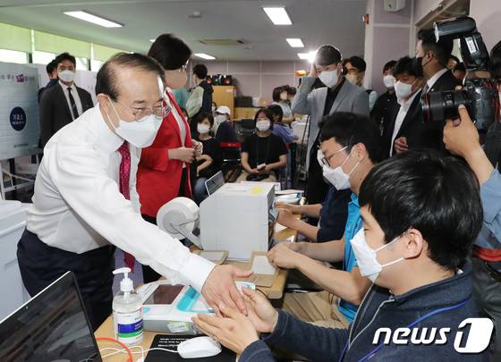 (인천=뉴스1) 이재명 기자 = 윤형선 국민의힘 인천 계양을 후보가 28일 오전 인천 계양구 계산2동행정복지센터에 마련된 사전투표소에서 투표에 앞서 선거관리위원회 직원과 인사하고 있다. 2022.5.28/뉴스1