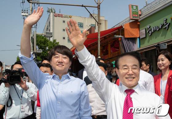(인천=뉴스1) 이재명 기자 = 이준석 국민의힘 대표와 윤형선 인천 계양을 후보가 28일 오전 인천 계양구 계산2동행정복지센터에 마련된 사전투표소에서 투표를 마친 후 다음 유세현장으로 이동하며 시민들과 인사하고 있다. 2022.5.28/뉴스1