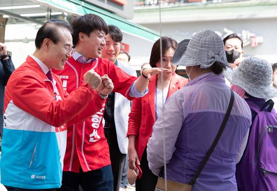 (인천=뉴스1) 이재명 기자 = 이준석 국민의힘 대표와 윤형선 인천 계양을 후보가 28일 오전 인천 계양구 계산2동행정복지센터에 마련된 사전투표소에서 투표를 마친 후 다음 유세현장으로 이동하며 시민들과 인사하고 있다. 2022.5.28/뉴스1