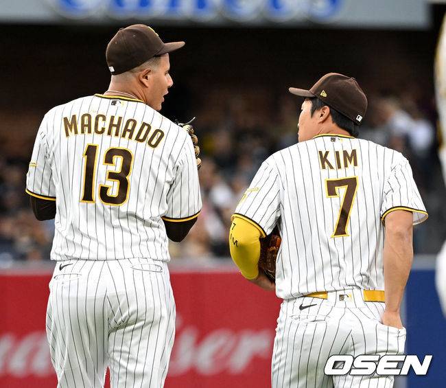 3회초 수비에 나서는 샌디에이고 유격수 김하성(오른쪽)과 3루수 매니 마차도가 대화를 나누고 있다. 2022.05.28 /dreamer@osen.co.kr