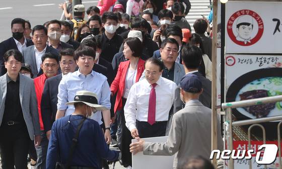 (인천=뉴스1) 이재명 기자 = 이준석 국민의힘 대표와 윤형선 인천 계양을 후보가 28일 오전 인천 계양구 계산2동행정복지센터에 마련된 사전투표소에서 투표를 하기 위해 이동하고 있다.(공동취재) 2022.5.28/뉴스1
