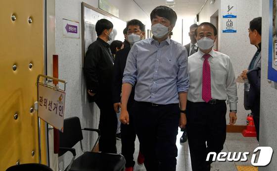 (인천=뉴스1) 이재명 기자 = 이준석 국민의힘 대표와 윤형선 인천 계양을 후보가 28일 오전 인천 계양구 계산2동행정복지센터에 마련된 사전투표소에서 투표를 하기 위해 이동하고 있다.(공동취재) 2022.5.28/뉴스1