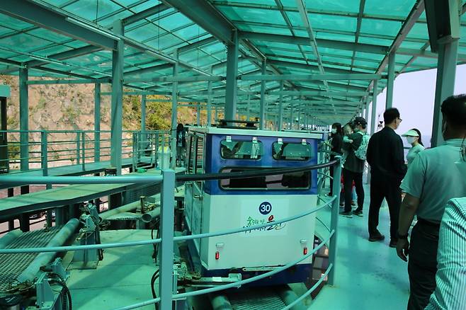 구간의 끝에 다다르면 회전판에 놓여 다시 왔던 곳으로 돌아가게 된다. 같이 갔던 일행들이 뒤에 타고 왔다가 서로 사진을 찍어주고 있다.