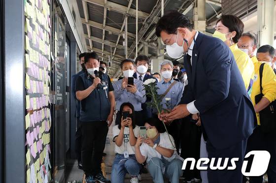 (서울=뉴스1) 이동해 기자 = 송영길 더불어민주당 서울시장 후보가 28일 서울 광진구 구의역에서 지난 2016년 스크린 도어를 고치다 사망한 김 군을 추모하며 헌화하고 있다. 2022.5.28/뉴스1