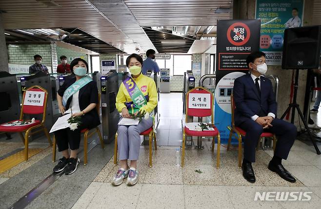 [서울=뉴시스] 조성우 기자 = 구의역 참사 6주기를 맞은 28일 오전 서울 광진구 구의역 대합실에서 열린 추모식에서 송영길 더불어민주당(오른쪽부터), 권수정 정의당, 신지혜 기본소득당 서울시장 후보가 자리하고 있다. 2022.05.28. xconfind@newsis.com