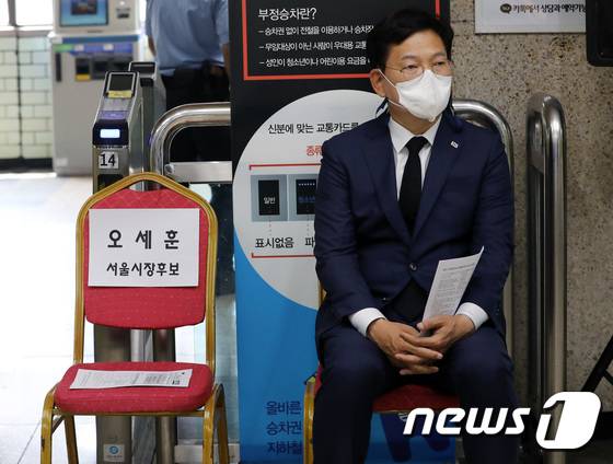 (서울=뉴스1) 이동해 기자 = 송영길 더불어민주당 서울시장 후보가 28일 서울 광진구 구의역에서 열린 추모식 및 생명안전 시민약속식에 참석해 순서를 기다리고 있다. 송 후보 옆자리에 비어있는 오세훈 국민의힘 서울시장 후보의 자리. 2022.5.28/뉴스1