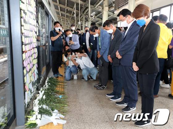 (서울=뉴스1) 이동해 기자 = 구의역 참사 6주기를 맞은 28일 오전 서울 광진구 구의역 9-4 승강장에서 고민정 더불어민주당 의원이 지난 2016년 스크린 도어를 고치다 사망한 김 군을 추모하며 묵념하고 있다. 2022.5.28/뉴스1
