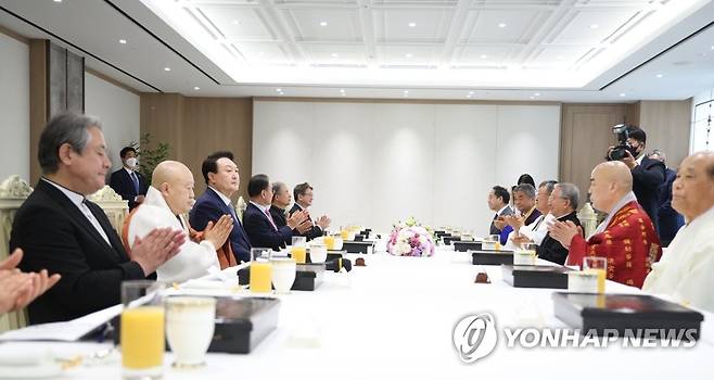 (서울=연합뉴스) 안정원 기자 = 윤석열 대통령이 28일 서울 용산 대통령실 청사에서 열린 7대 종단 지도자 오찬에서 발언을 마친 뒤 박수받고 있다. 오른쪽 맨위부터 시계방향으로 강승규 시민사회수석, 천도교 박상종 교령, 원불교 나상호 교정원장, 천주교 광주대교구장 김희중 대주교, 천태종 총무원장 무원 스님, 손진우 성균관장, 한국기독교교회협의회 이홍정 총무, 조계종 총무원장 원행 스님, 윤석열 대통령, 한국교회종연합 대표회장 류영모 목사, 한국천주교주교회의 이용훈 의장주교, 박보균 문화체육관광부 장관. 2022.5.28