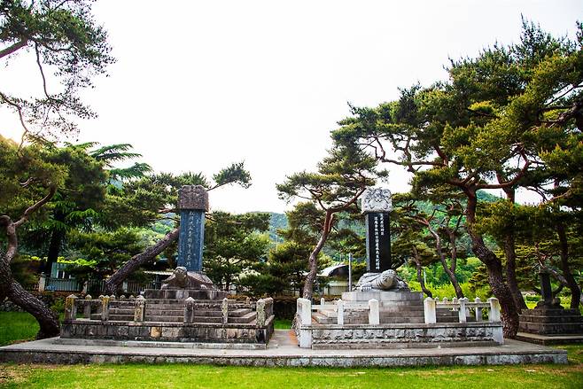 | ▲ 홍천뢰 장군과 그의 조카 홍경승 선생의 추모비. 이 곳이 부림 홍씨의 집성촌임을 말해준다. 묘비 앞 잔디밭은 임진왜란 시절 홍 장군이 주민들을 의병으로 훈련했던 곳이다. |